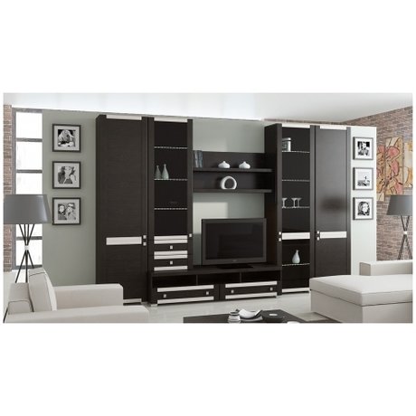 Уютная гостиная с набором самой необходимой современной мебели в приятной цветовой гамме: каркас выполнен в благородном цвете венге цаво, а фасад имеет два оттенка - венге цаво и комби. В состав набора входит: шкаф высокий с глухими дверями - 2 шт., шкаф высокий со стеклянными дверями - 1 шт., полка малая - 2 шт., тумба большая - 1 шт., шкаф-надстройка с ящиками - 1 шт.