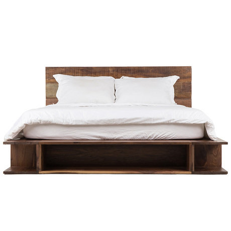 Кровать-платформа Bonnie выполнена в японском стиле. Современный дизайн воплощен с помощью старинного материала. Кровать королевских размеров и изготовлена вручную из массива грецкого ореха. Роскошная фактура антикварной древесины перобы, просуществовавшей большую часть своей «жизни» в виде телефонных столбов, отчетливо видна на широких гладких досках изголовья. Внизу, под основанием, расположены ниши-полки для хранения книг и журналов. Благодаря этому дизайнерскому решению кровать словно парит над полом.