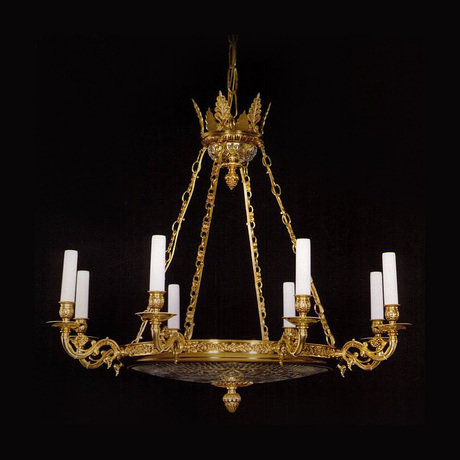Люстра 10-ти рожковая с узким хрустальным прозрачным плафоном. Арматура с золотым покрытием в 24 карата. Дизайн ламп выполнен в виде свечей в подсвечниках. Люстра станет прекрасным украшением холла или гостиной. Данная модель требует высоких потолков и просторных помещений. Высоту светильника можно регулировать за счет звеньев цепи. Количество лампочек: 10. Мощность: 10 x 40 Вт. Тип лампы: Накаливания, E14.