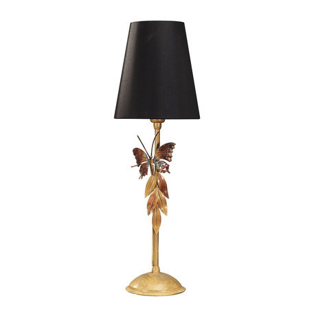Настольная лампа на металлической арматуре золотого цвета. Декоративный элемент на основании в виде бабочки на лепестках. Черный плафон скрывает лампу. Светильник выполнен в стиле Арт Деко. Дизайн: Karen Lenz. Количество лампочек: 1. Мощность: 1 x 42 Вт. Тип лампы: Накаливания, E14.